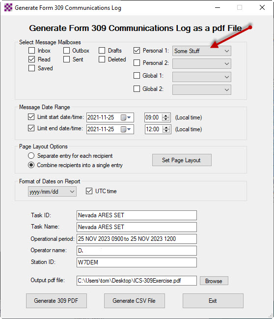 Clicking "Generate 309 PDF" creates an ICS309 in PDF format and shows where it has been saved on your computer.