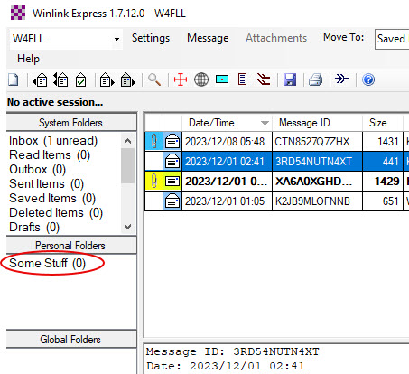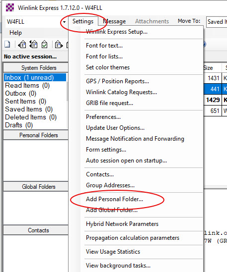requires that you have previously added a folder in the main Winlink screen under "Settings → Add personal folder" as shown below.